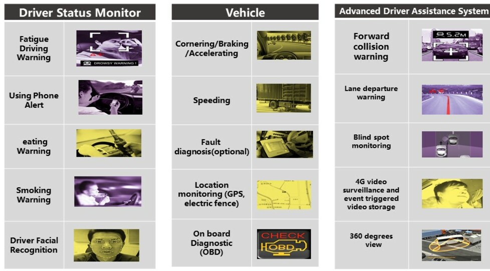 - AI video analytic technology based 360 degrees blind -spot real-time alert, driver fatigue warning, advance driver assistance system, post-accident analysis, geofence